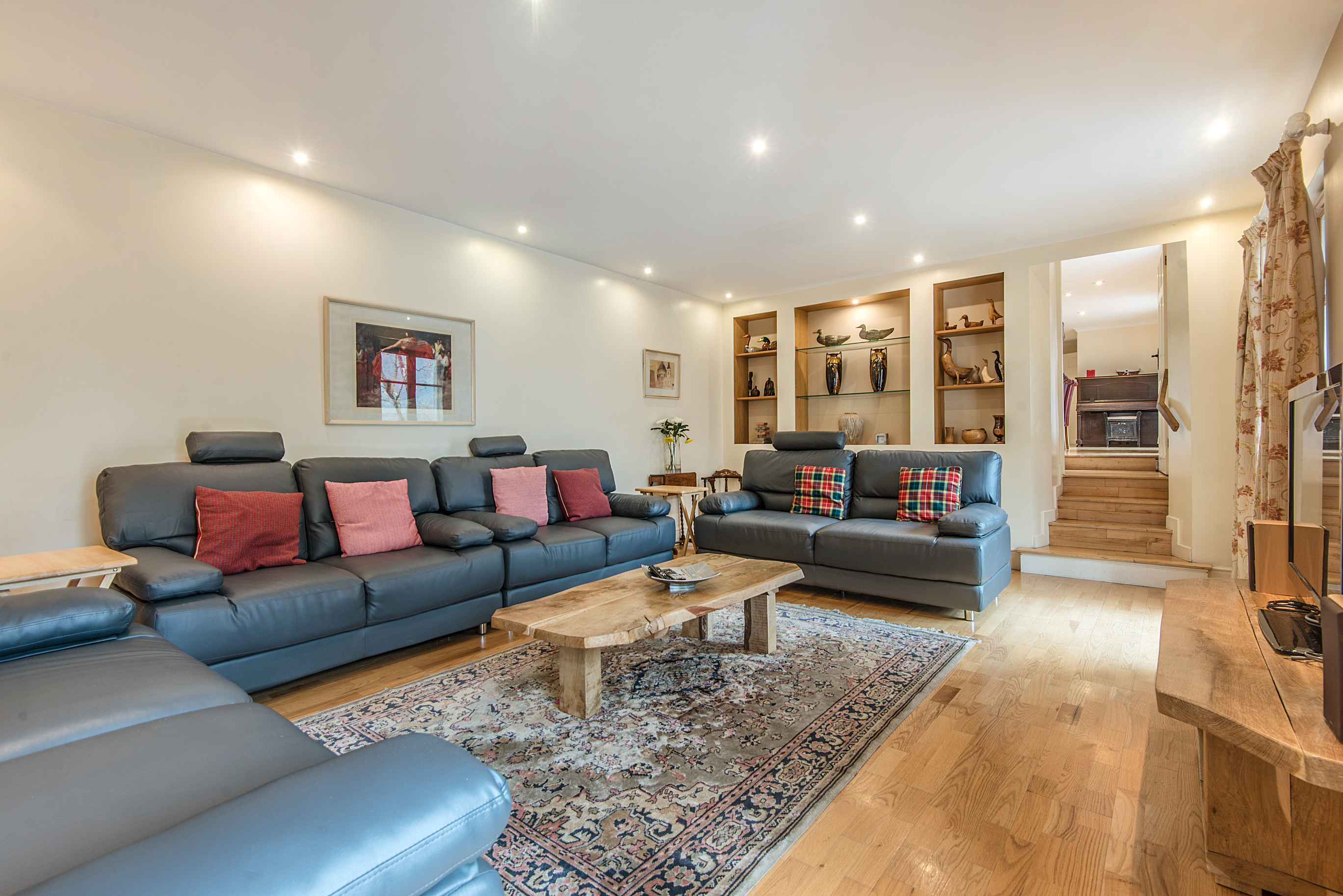 The living/kitchen area is open plan with lots of space, comfy sofas and oak flooring.